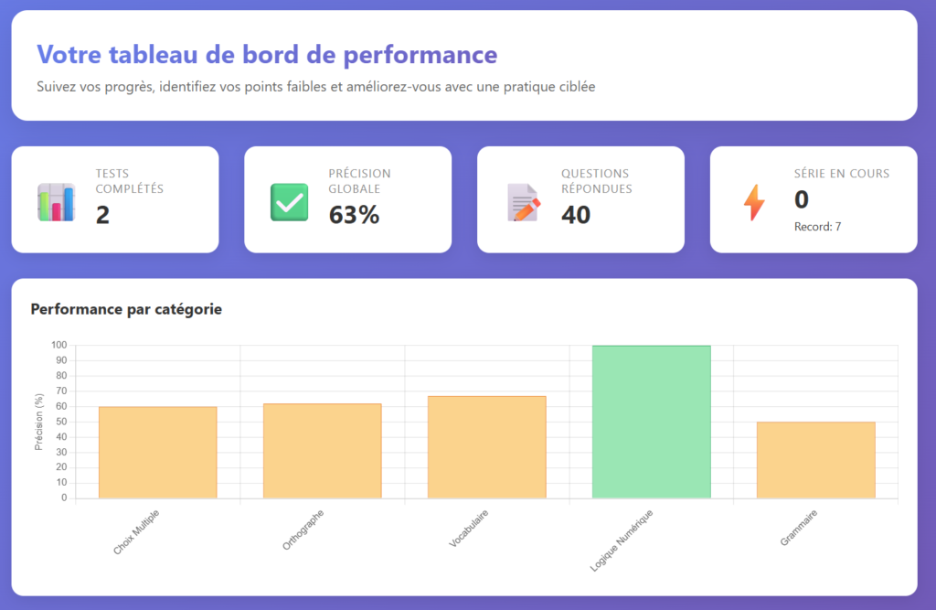 Les questions s’adaptent à votre niveau. Vous suivez vos progrès et identifiez vos points faibles.